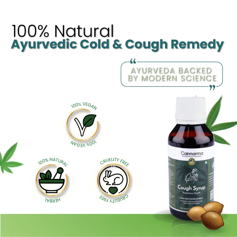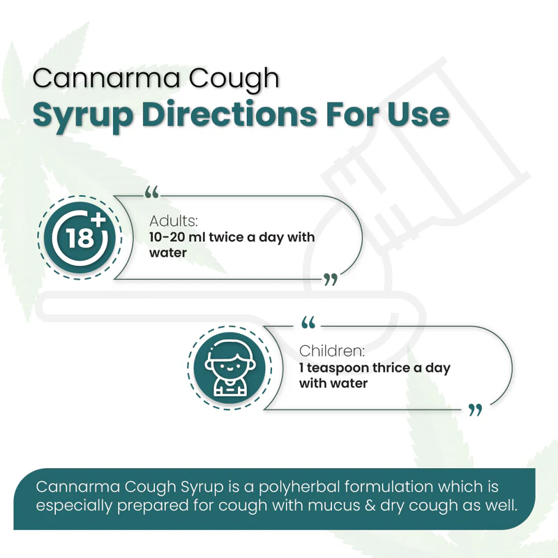 Cannarma Cough Syrup is formulated to offer therapeutic benefits in common colds, coughs, airway inflammation, sore throat, and to support overall respiratory health.