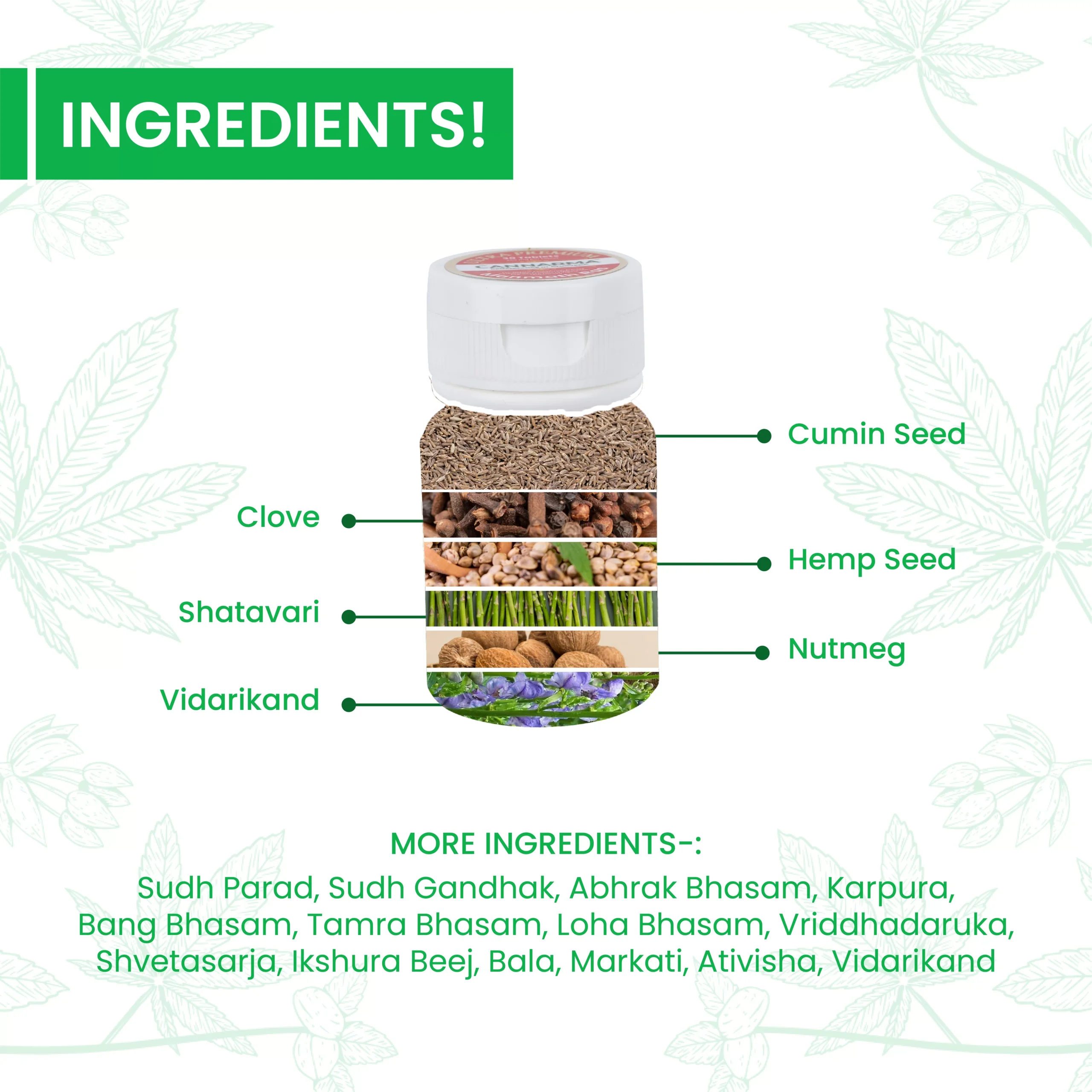 Each 250 mg Tablet contains:- Sudh Parad – 40 mg, Sudh Gandhak – 40 mg, Abhrak Bhasm – 20 mg, Karpura (Cinnamomum Camphora) – 10 mg, Bang Bhasm – 5 mg, Tamra Bhasm – 5 mg, Loha Bhasm – 10 mg, Jeeraka (Cuminum cyminum) – 2.5 mg, Vriddhadaruka (Argyreia nervosa) – 2.5 mg, Ikshura Beej (Hygrophilla auriculata) – 2.5 mg, Bala (Sida cordifolia) – 2.5 mg, Markati (Mucuna Pruriens) – 2.5 mg, Ativisha (Aconitum heterophyllum) – 2.5 mg, Jatiphala – Nutmeg (Myristica fragrans) – 2.5 mg, Lavanga (Syzygium aromaticum) – 2.5 mg, Hemp Seeds – 2.5 mg, Vidarikand (Pueraria tuberosa) – 2.5 mg, Shatavari (Asparagus racemosus) – 2.5 mg, Shvetasarja (Vateria indica) – 2.5 mg, Yamanika (Trachyspermum ammi) – 2.5 mg