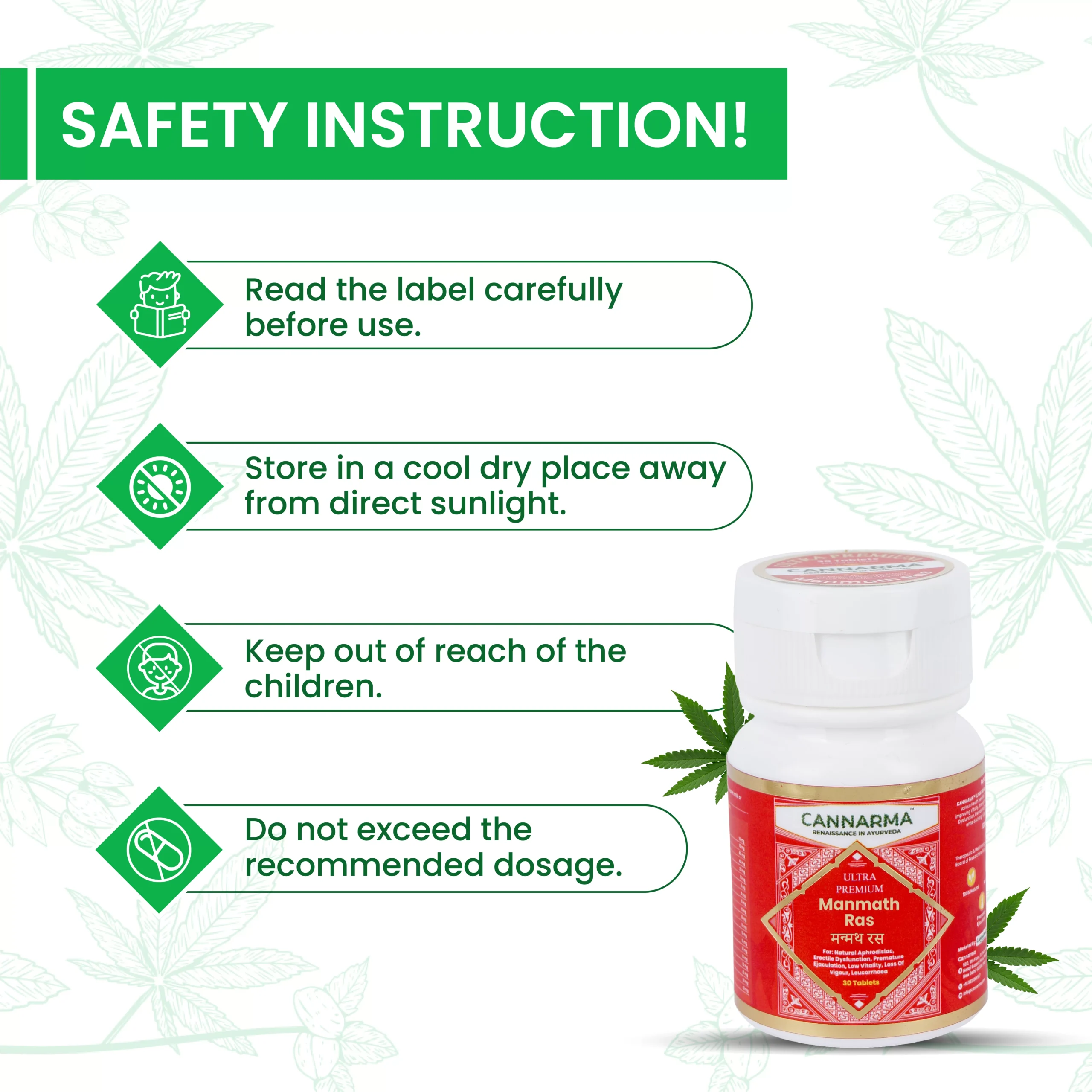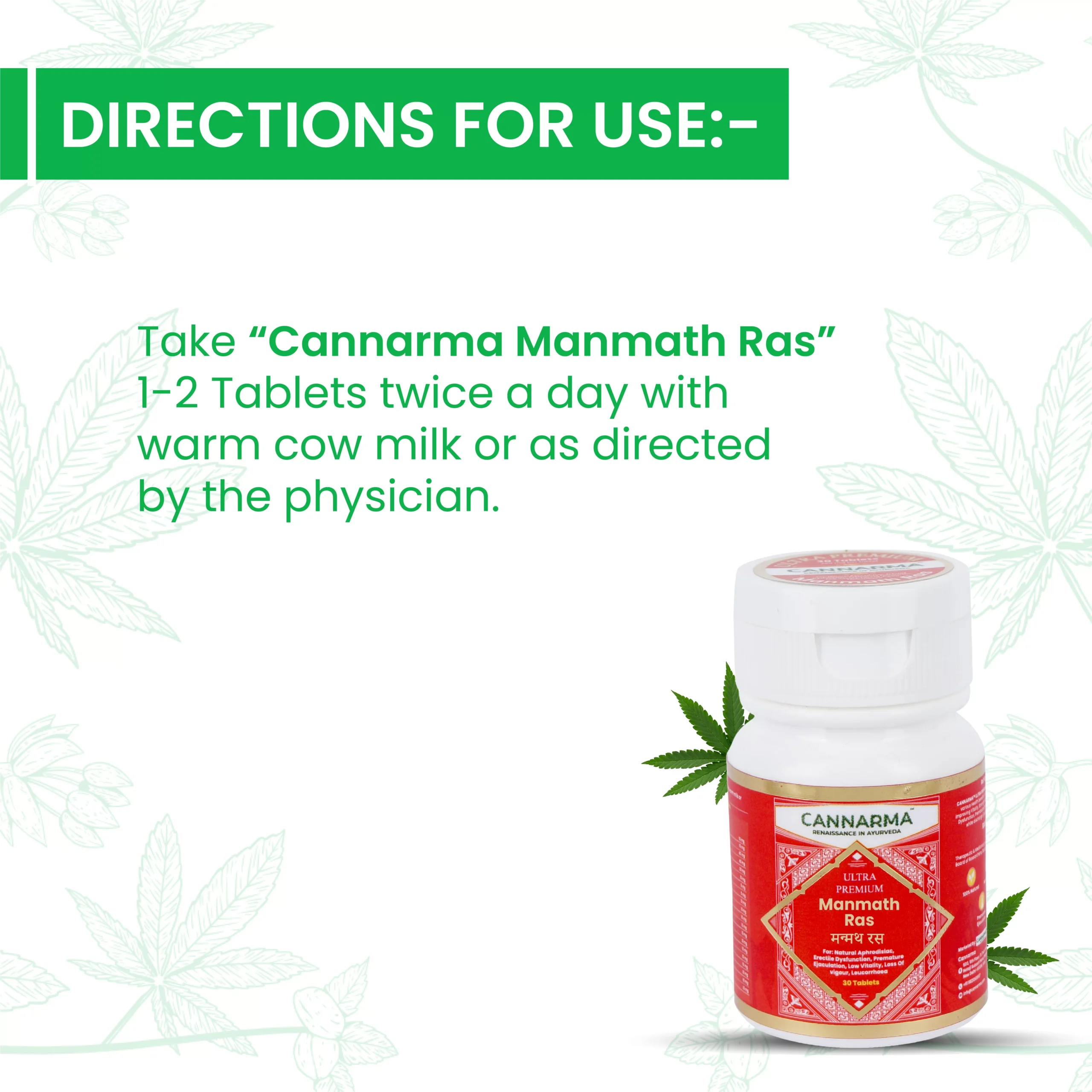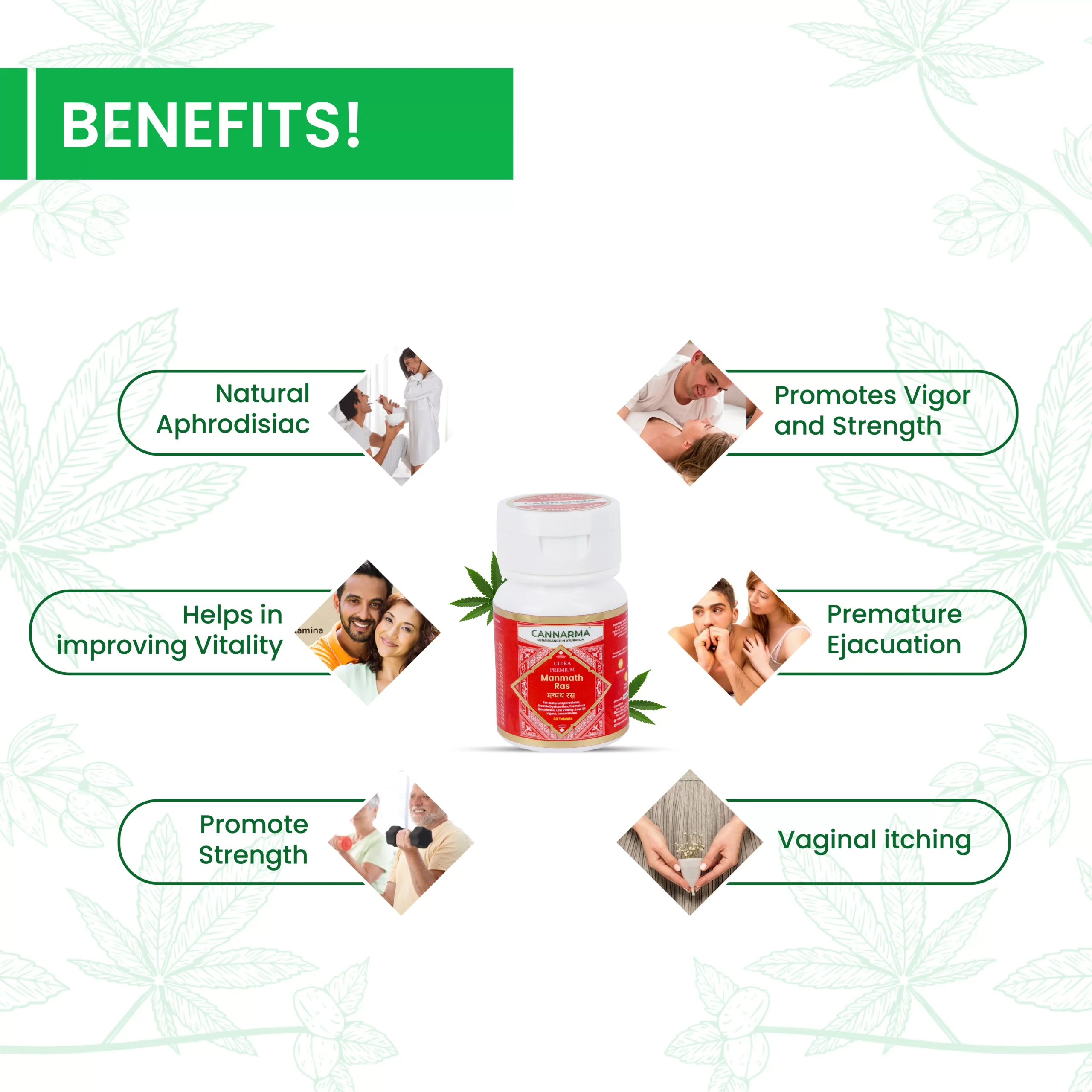 Cannarma Ultra Premium Manmath Ras Tablet is a herbal supplement formulated to support sexual wellness, vitality, and strength. It aids in addressing conditions like premature ejaculation, erectile dysfunction, and vaginal issues in women.